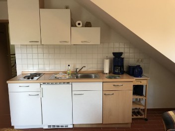 einer Küchenzeile, einem Badezimmer mit Dusche und einem
