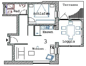 Die Ferienwohnung 3 befindet sich im Erdgeschoß und besteht aus einem Schlafzimmer, einer Wohnstube, einem Küchenbereich, einem Bad mit Dusche, einer Loggia und Terrasse. Der Wohnraum ist ideal für 2-4 Personen.