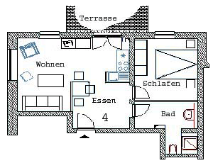 Die Ferienwohnung 4 besteht aus einer Schlafzimmer, einem Bad, einem Wohnzimmer, einer Küchenzeile sowie einer Sonnenterrasse und ist ideal geeignet für 2-4 Personen.