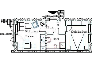 Die Ferienwohnung 5 besteht aus einer Küchenzeile, einer Essecke, einem Bad, einem Wohnbereich mit Terasse, sowie einem Schlafzimmer für 2 Personen.